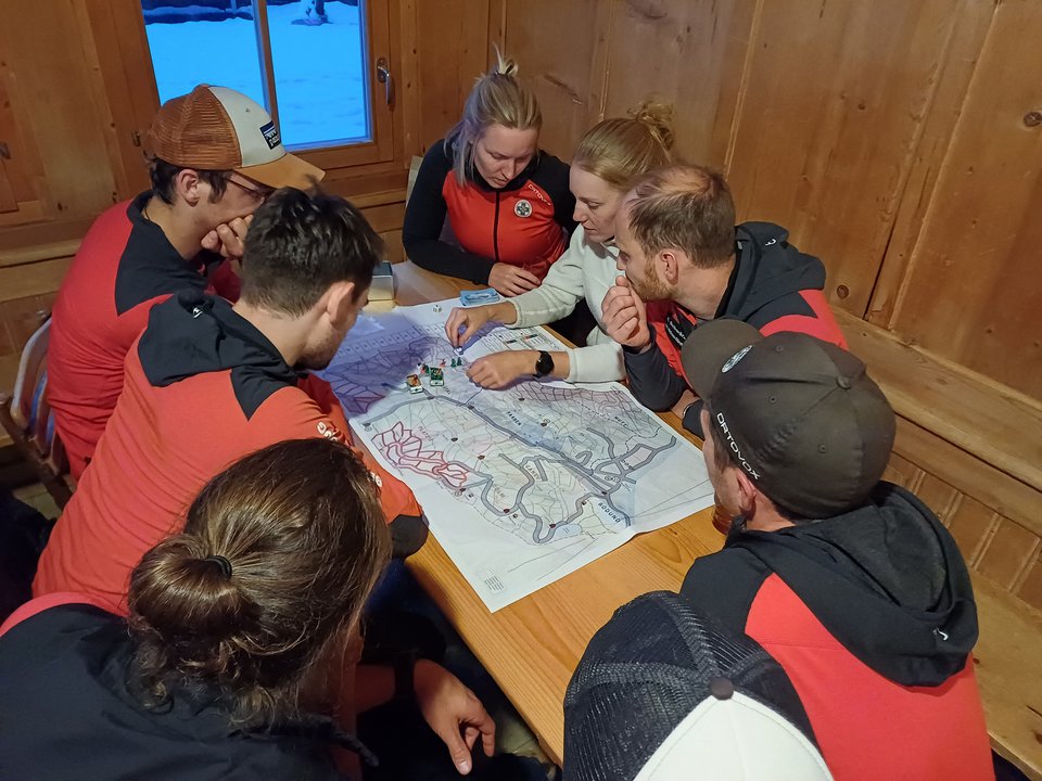 Am Freitagvormittag wurden aufgrund von starkem Schneefall ein paar Theorieeinheiten und kleinere Einzelarbeiten eingeschoben. Dabei ging es hauptsächlich um Themen rund um Materialkunde, Organisationsstruktur, Kursvorbereitung, Kursaufbau und Hilfestellung für Ausbildungsthemen. Nach dem Mittagessen ging es dann erstmals an den (verschneiten) Fels wo die Teilnehmer ihre ersten Gruppenaufgaben lösten und anschließend vorstellten. Diese waren Standplatzaufbau, Seilverlängerung und Sicherungstechnik. Am Abend meisterten die Kursteilnehmenden in zwei Gruppen zwei Aufgaben, die sie zur weiteren Auswertung filmten. Am Abend genossen wir noch das Bergrettungs-Planspiel, welches von unseren Kollegen aus Vandans entwickelt wurde. Prädikat: Sehr empfehlenswert!