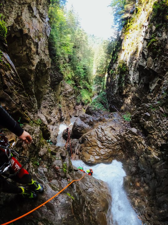 Diese Einteilung ermöglichte eine gezielte Ausbildung entsprechend des jeweiligen Kenntnisstandes. Grundlage des Programms war das Canyoning Handbuch, welches den Tag strukturierte und Themen wie Materialkunde, Begehung mit integrierter Seil- und Rettungstechnik behandelte.