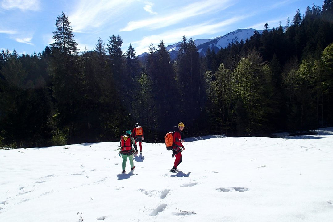Wir verlegten nach der morgendlichen Begrüßung zum Spätenbach. Das Wetter meinte es gut mit uns und ließ die Sonne vom blauen Himmel strahlen. Der Zustieg zum Einstieg erfolgte bei spät winterlichen Verhältnissen im Schnee.