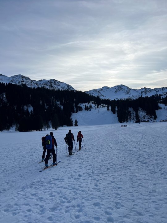 Nach einem Materialcheck erfolgte der gemeinsame Aufbruch zur Schwarzwasserhütte. Der ca. 2-stündige Aufstieg mit den Tourenschi wurde genutzt, um das Kennenlernen innerhalb der Gruppe zu fördern und erste Kenntnisse zu vermitteln.