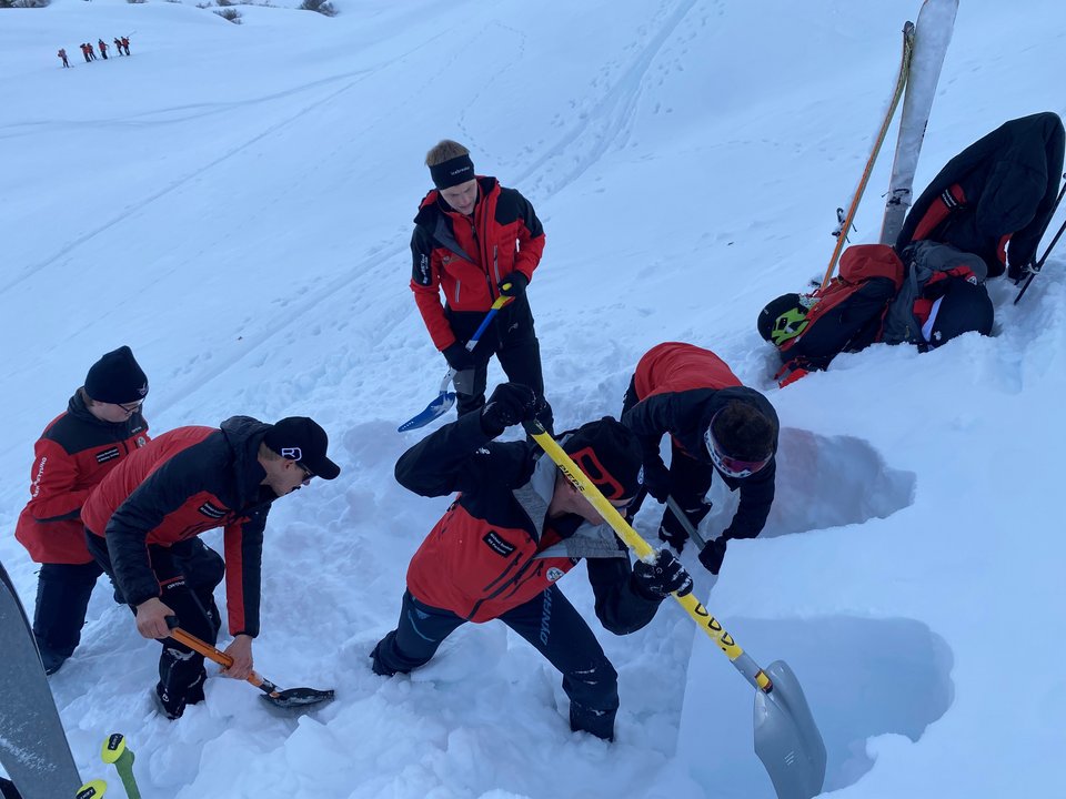 Das gelernte Wissen konnten die Anwärter in einer großen Lawinenübung anwenden. Insgesamt 5 Verschüttete mussten von den Anwärtern lokalisiert, ausgegraben und zum Teil reanimiert werden. Eine Sondierung des Lawinenkegels war nötig, um den letzten Verschütteten zu finden.