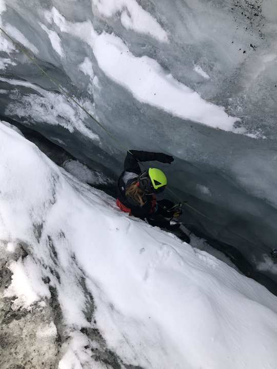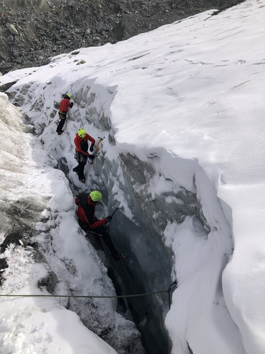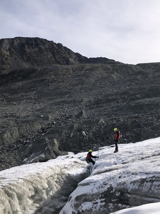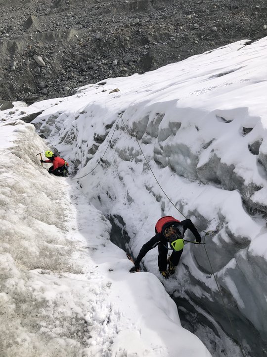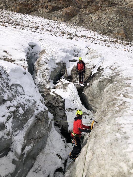 Der Sonntag brachte nach dem Pflichtprogramm die Kür: kleine Tricks und Kniffe, die das Leben am Gletscher und im Bergsport leichter machen. Vom Kennenlernen vieler moderner kleiner Hilfsmittel und der spürbaren Erleichterung, die sie uns bringen, bis hin zum Rückzug im Steileis ohne Materialverlust und ersten Versuchen mit Eisgeräten in beiden Händen.