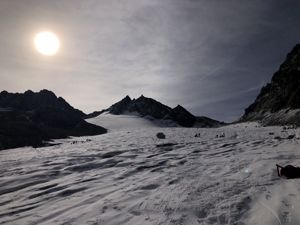 Wenn die Passstraße auf die Bielerhöhe gesperrt ist, muss eine Alternative her (der Weg ins Tirol ist für uns keine ;)): also ab in die Vermunt Seilbahn und weiter mit dem Tunneltaxi. Oben angekommen werden wir stilecht mit Schneefall begrüßt, ganz so, wie man ihn sich eigentlich im Winterkurs wünschen würde. Während wir Teilnehmer*innen, 33 an der Zahl, sowie 4 Co-Ausbilder und 7 Alpinausbilder mehr oder weniger motiviert losmarschieren, gönnen sich die beiden Kursleiter ein bisschen Luxus auf vier Rädern – samt Schneekettenmontage. Der tolle Nebeneffekt, alle unsere Seile kommen so trocken zur Hütte. Zur Belohnung dann für alle: 2 Tage Sonnenschein auf der Wiesbadener Hütte.