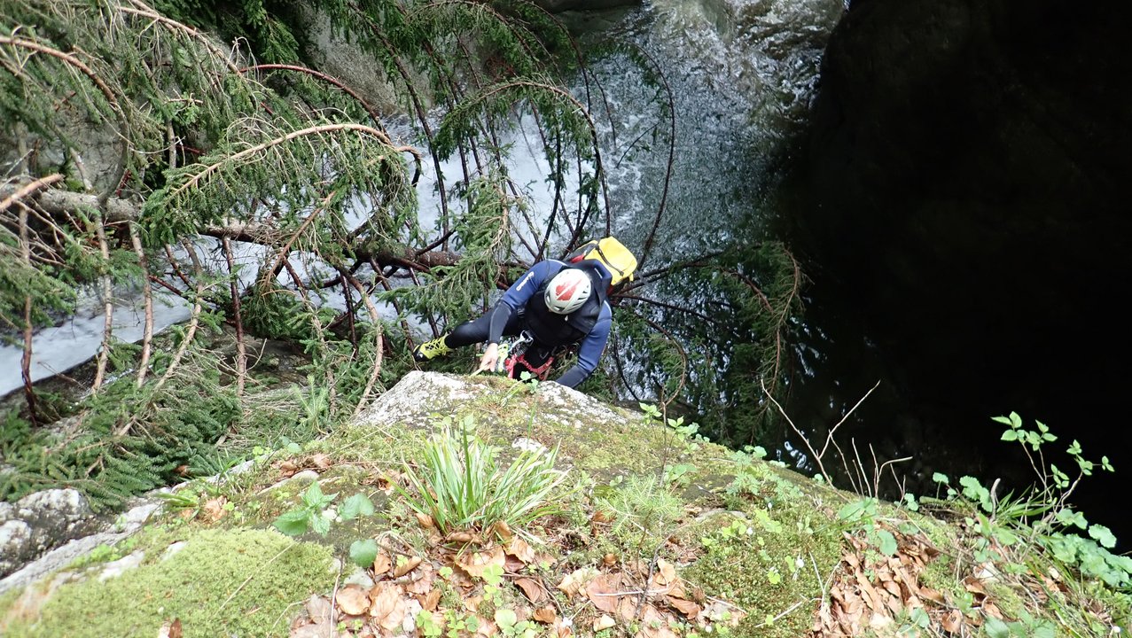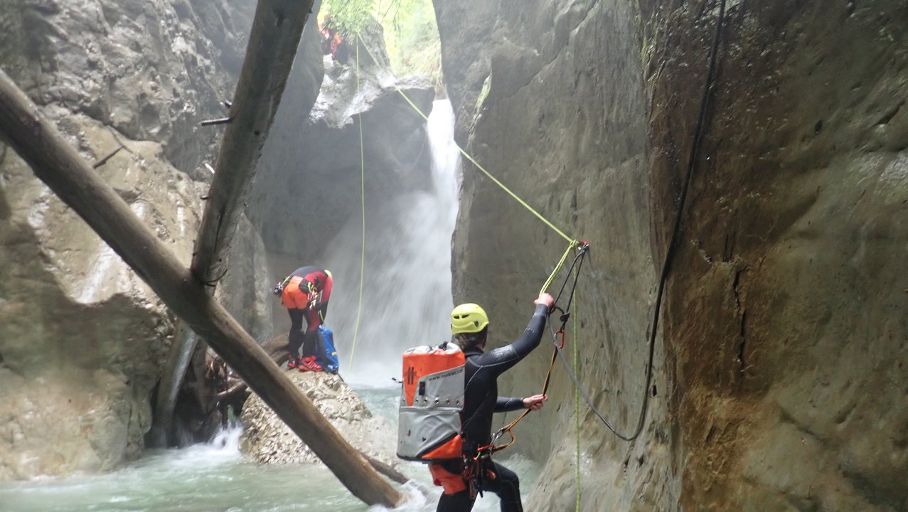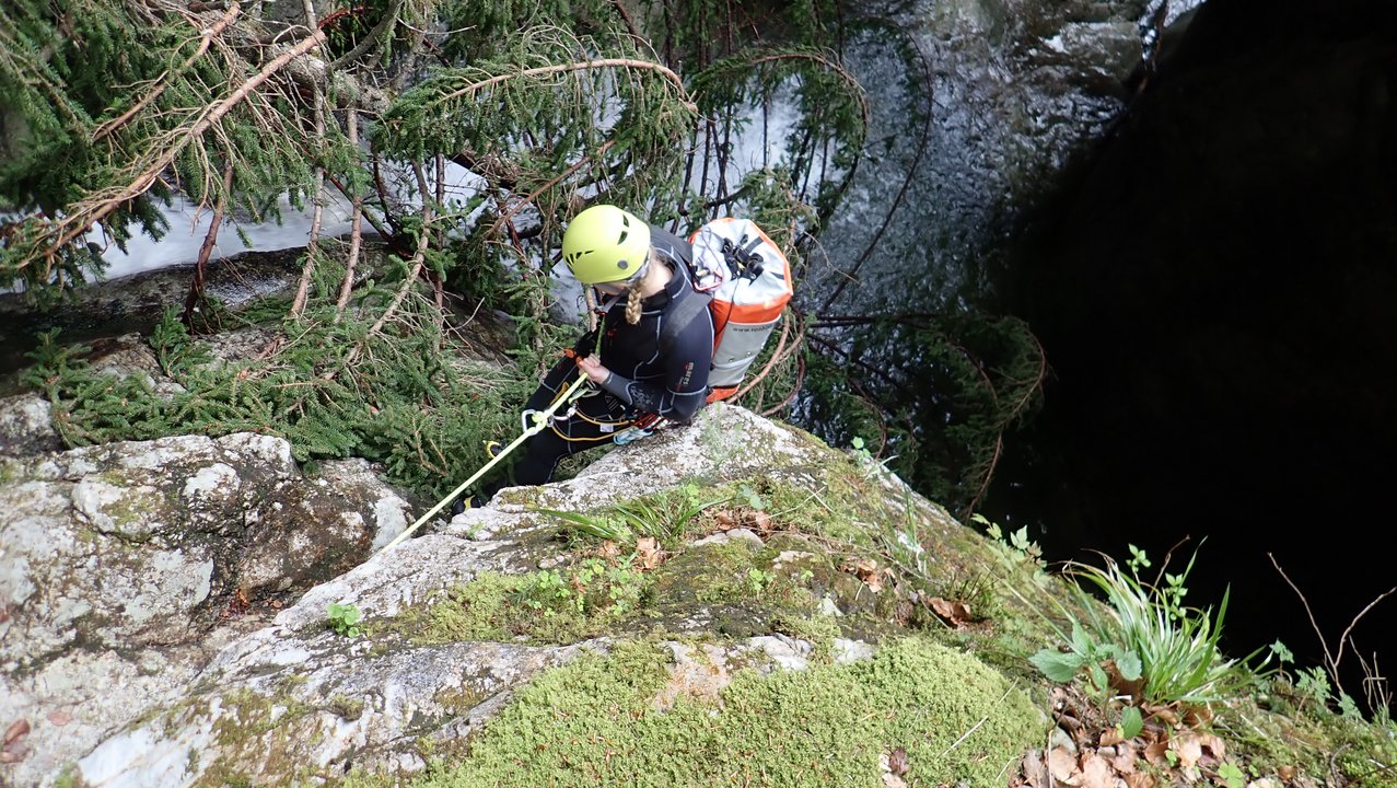 Anschließend wurde das Dornbirner Canyoning-Gebiet (un)sicher gemacht. Die verschiedenen Gruppen übten und erlernten in den Schluchten der Kobelache und Spätenbach wichtige Seiltechniken für das begehen, abseilen und retten von Personen in der Schlucht.