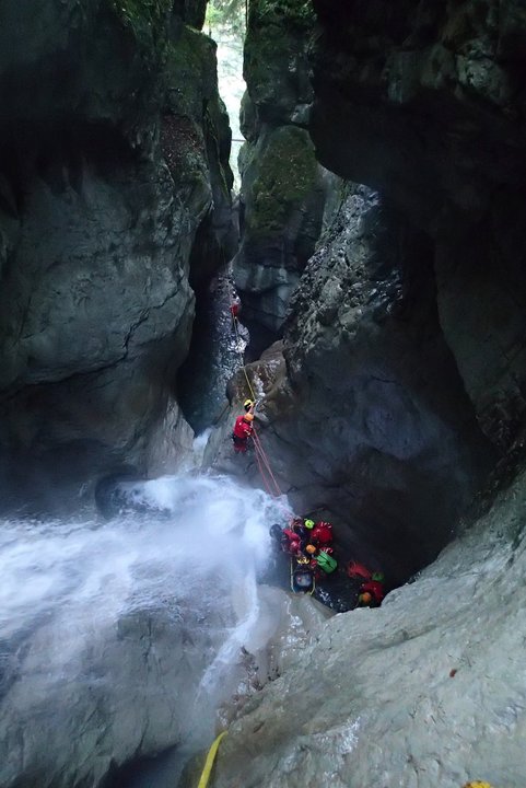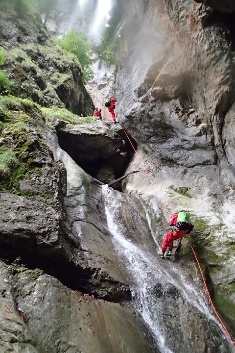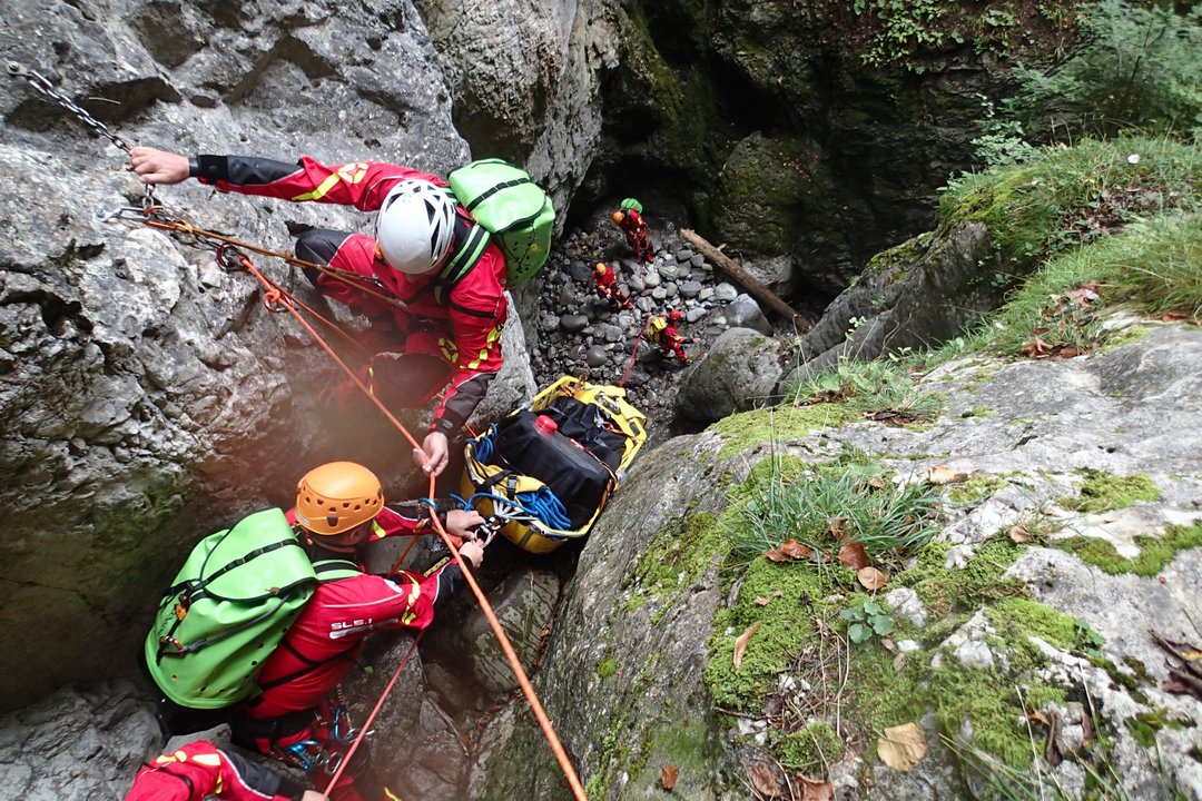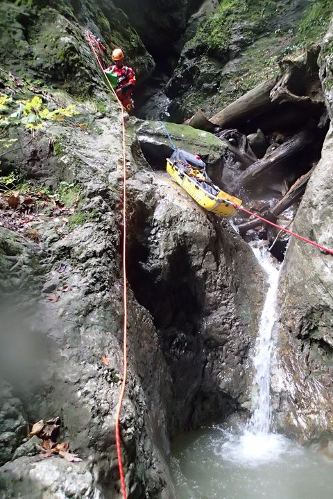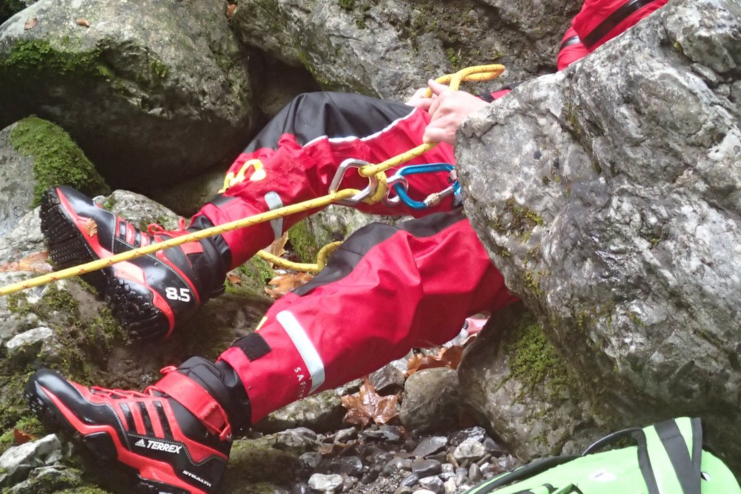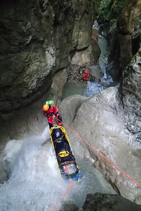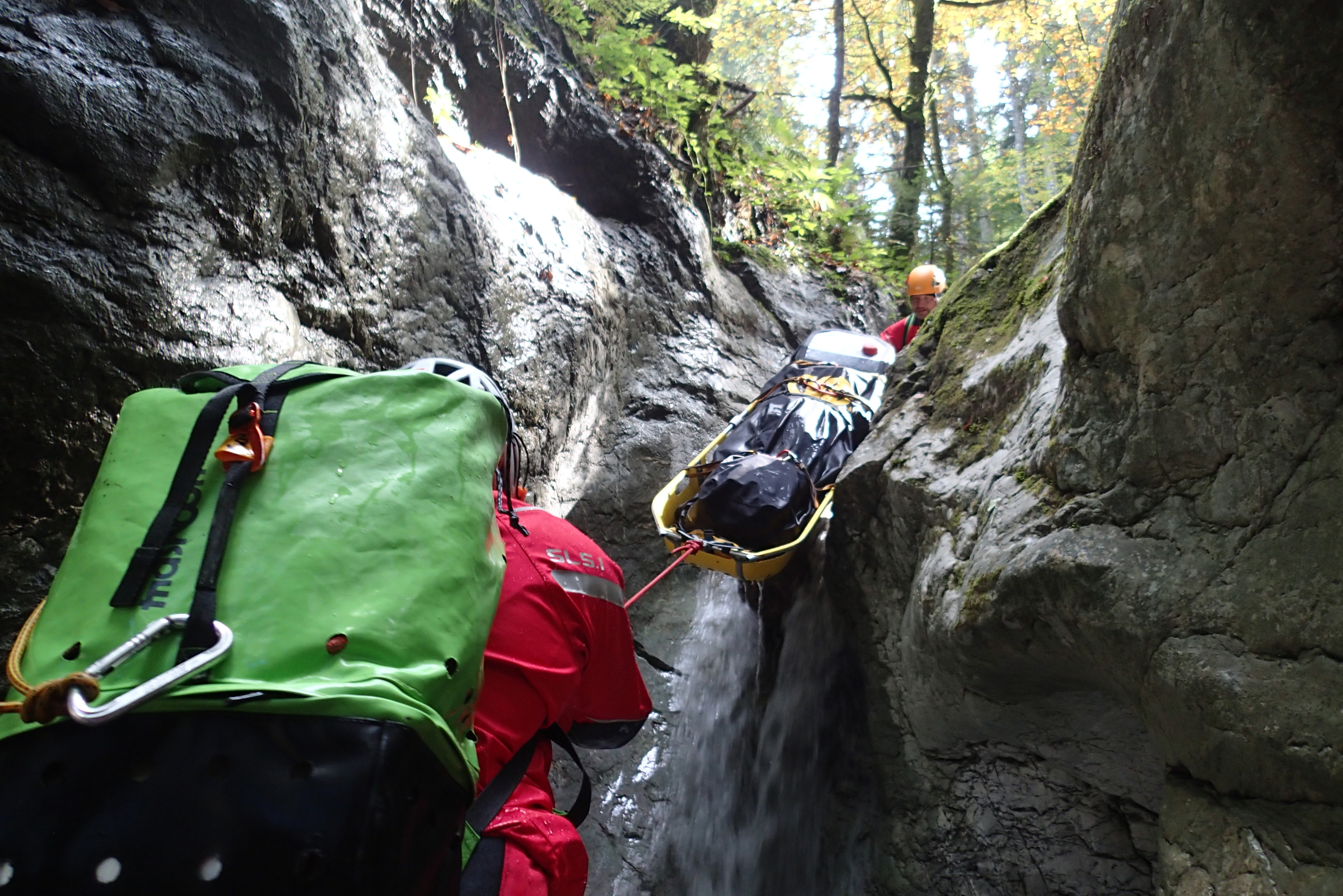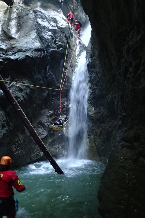 Im Anschluss verlegten wir die Schulung zur zweiten Örtlichkeit, dem Rudachbach. Da sich dieser Canyon immer größerer Beliebtheit erfreut, war es wichtig, auch diesen Bach mit der Trage genau anzuschauen. Auch hier wurde die Aufgabe bestens umgesetzt. Der Rudachbach verlangte von allen Konzentration, Können und Geschicklichkeit ab und so konnte die Trage mit dem „Verletzten“ in einer beachtlichen Zeit am Fuße vom Wasserfall abgesetzt werden.