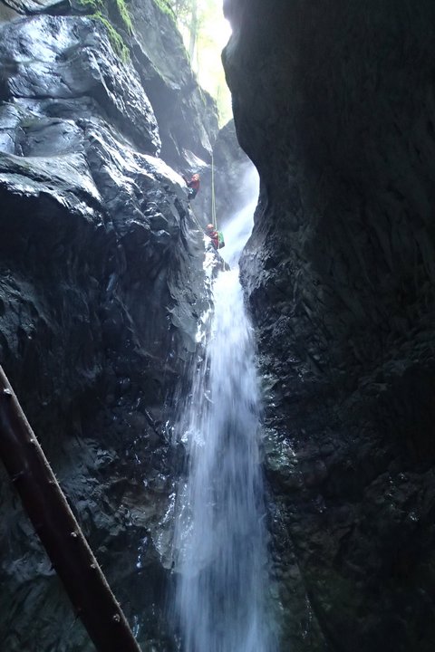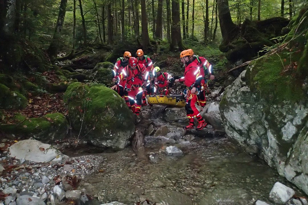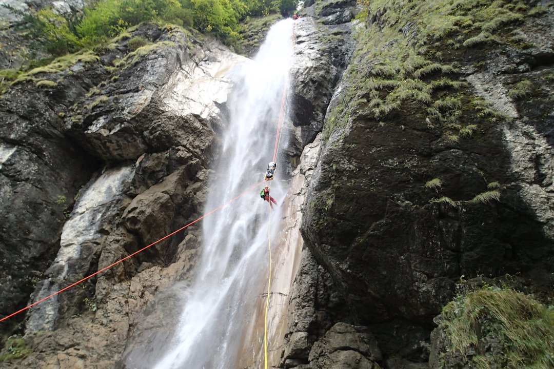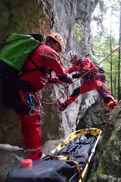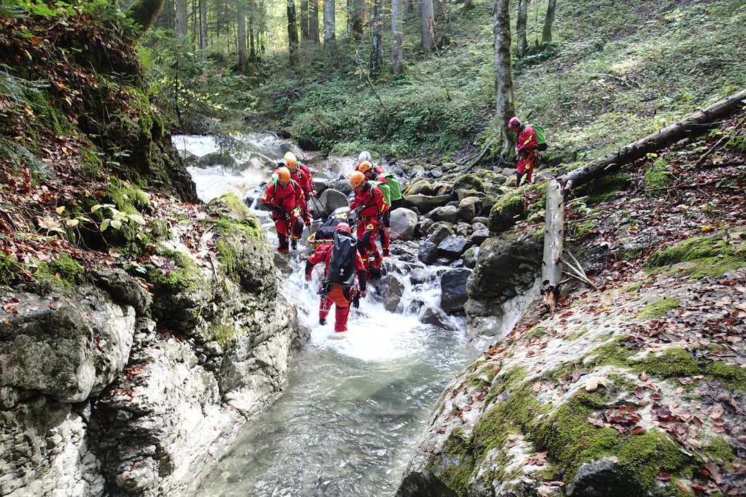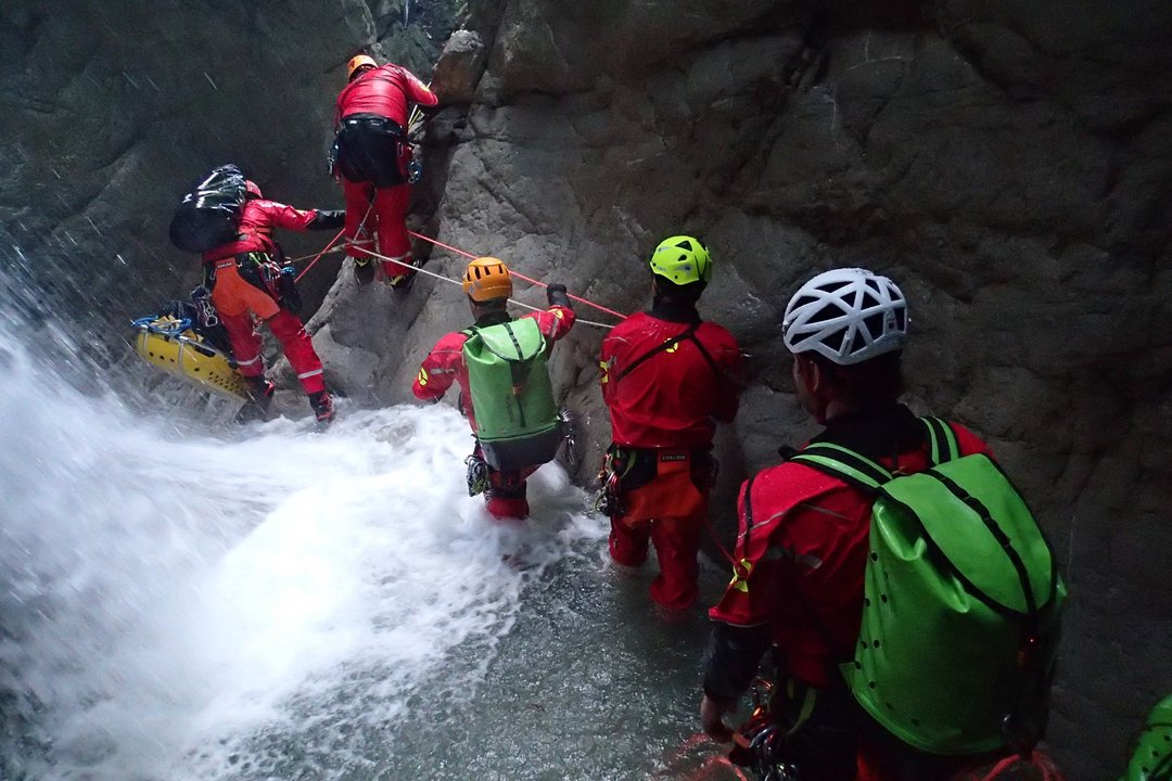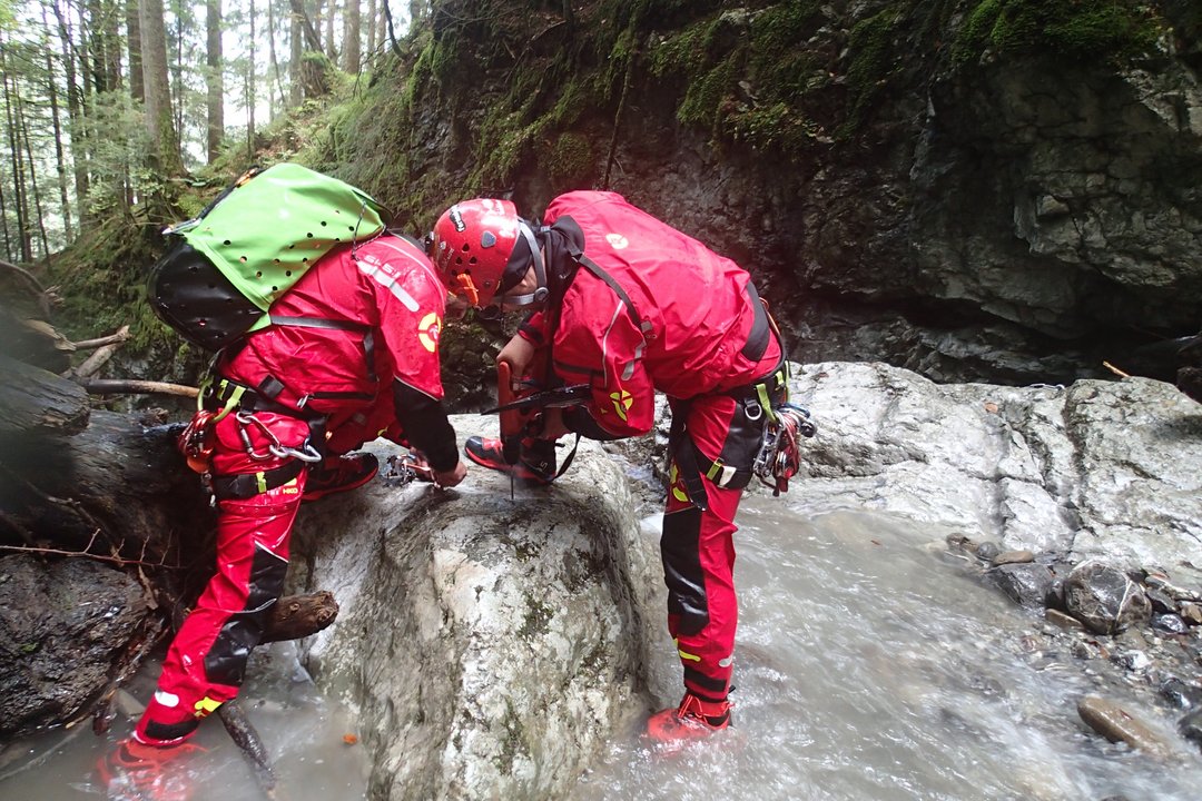 Im Anschluss verlegten wir die Schulung zur zweiten Örtlichkeit, dem Rudachbach. Da sich dieser Canyon immer größerer Beliebtheit erfreut, war es wichtig, auch diesen Bach mit der Trage genau anzuschauen. Auch hier wurde die Aufgabe bestens umgesetzt. Der Rudachbach verlangte von allen Konzentration, Können und Geschicklichkeit ab und so konnte die Trage mit dem „Verletzten“ in einer beachtlichen Zeit am Fuße vom Wasserfall abgesetzt werden.