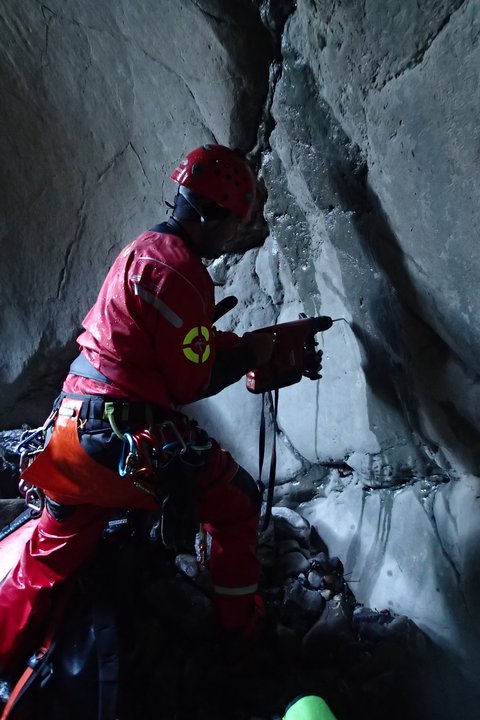 Zur Spezialausrüstung zählte auch eine Bohrmaschine von HILTI mit Material für den Standplatzbau. Auch der Standplatzbau wurde so in beiden Bächen umgesetzt, damit eine sichere Überwindung von einzelnen Stellen mit der Trage noch besser erfolgen konnte. Dabei hat sich die wiederverwendbare Anschlageinrichtung COEUR PULSE von Petzl bewährt.