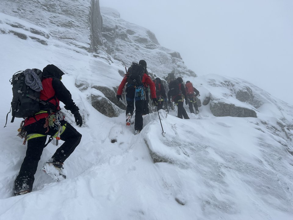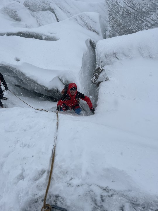 Der Samstag auf dem Ochsentaler-Gletscher widmete sich dem professionellen Lehrauftrag der zukünftigen Ausbildner. Bei starkem Wind, schlechter Sicht und heftigem Schneefall kämpften sich die sechs Gruppen über den Mittelsteig auf den Gletscher. Moderne Hilfsmittel wichen hier Geländekenntnis, Menschenverstand und Orientierungsgabe. Entsprechend zeitlich versetzt erreichten die Gruppen den Gletscherabbruch oberhalb der Felsinsel. In sorgfältig vorbereiteten Lehrauftritten in Kleingruppen bewiesen die Kursteilnehmenden, wie sie einen Heimabend in der Ortsstelle, einen Anwärter- oder Gebietsstellenkurs oder einen Kurs auf Landesebene vorbereiten, wie sie Wissenstransfer maximieren und Lerneffekt nachhaltig sicherstellen werden: Unterteilt in zweimal drei Gruppen erarbeiteten kleine Teams Themenparks, wie, "Selbstrettung mittels Prusik- und Münchhausentechnik", "Kameradenrettung mit Seilrollenflaschenzug und Seilrolle" und "Eisparcours“.
