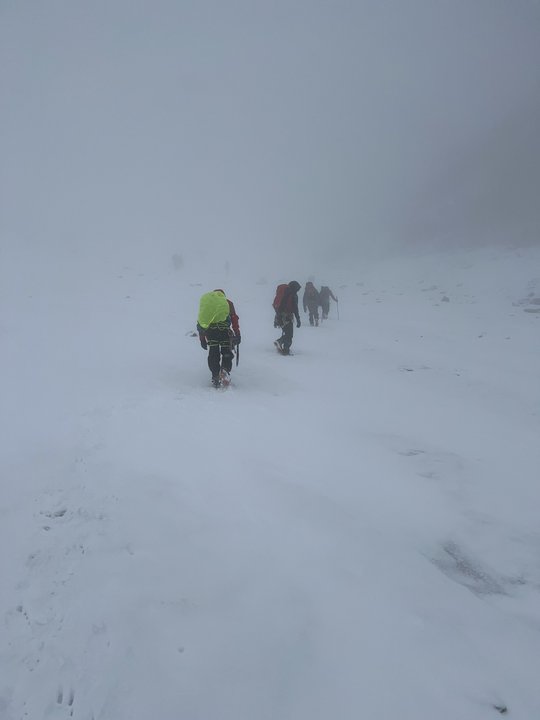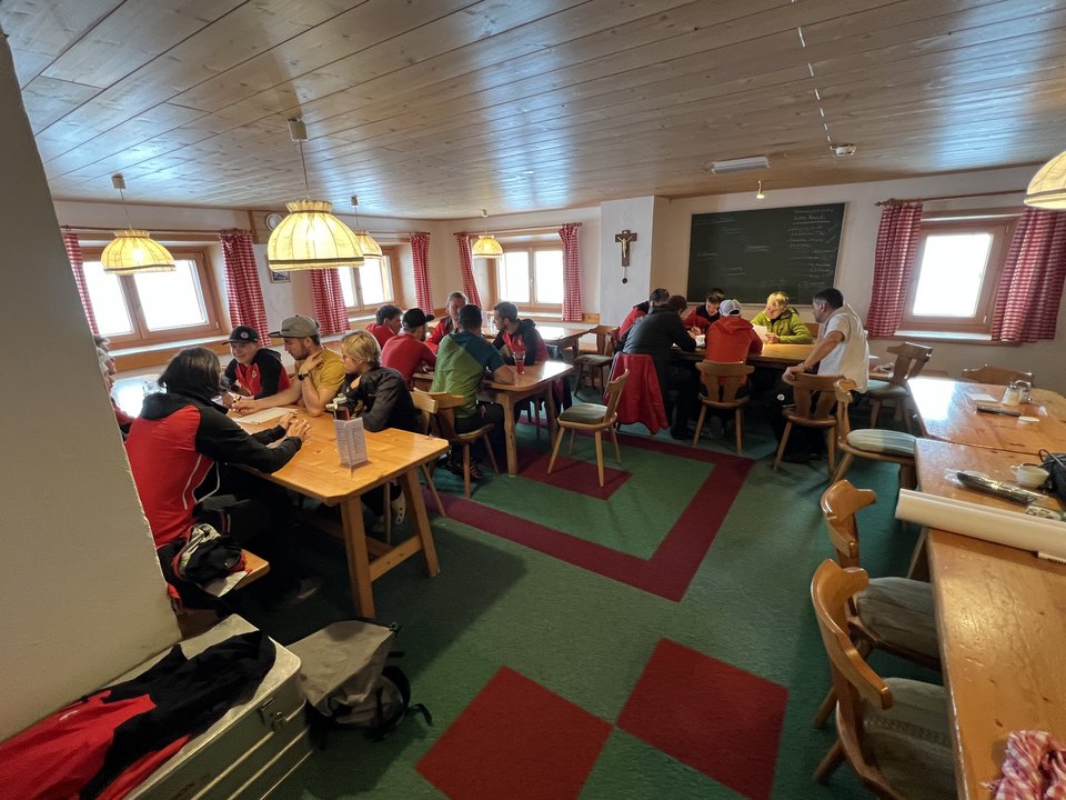 Bei strömendem Regen traversierten wir zu den Ausläufern des Ochsentaler-Gletschers und begannen mit wichtigen Inhalten, wie der Vorbereitung der Gletschertour (Partnercheck, Anseilen, Routenplanung, Marschzahl), Gehen im Eis und dem Standplatzbau. Dicker Nebel erschwerte die Orientierung, wenige trist tropfende Steinmännchen wiesen uns den Weg. Zurück auf der Hütte und nach einem herzhaften Schweinebraten mit Serviettenknödel und Sauerkraut kämpften die sechs Gruppen tapfer in voller Montur mit Gurt und Steigeisen und zusammengekettet mit der Selbstsicherungsschlinge gegeneinander in einem Hindernisparcours. Humor ist hier das Zauberwort, ein kleiner Wettbewerb, der Materialkunde und Teambuilding festigt.