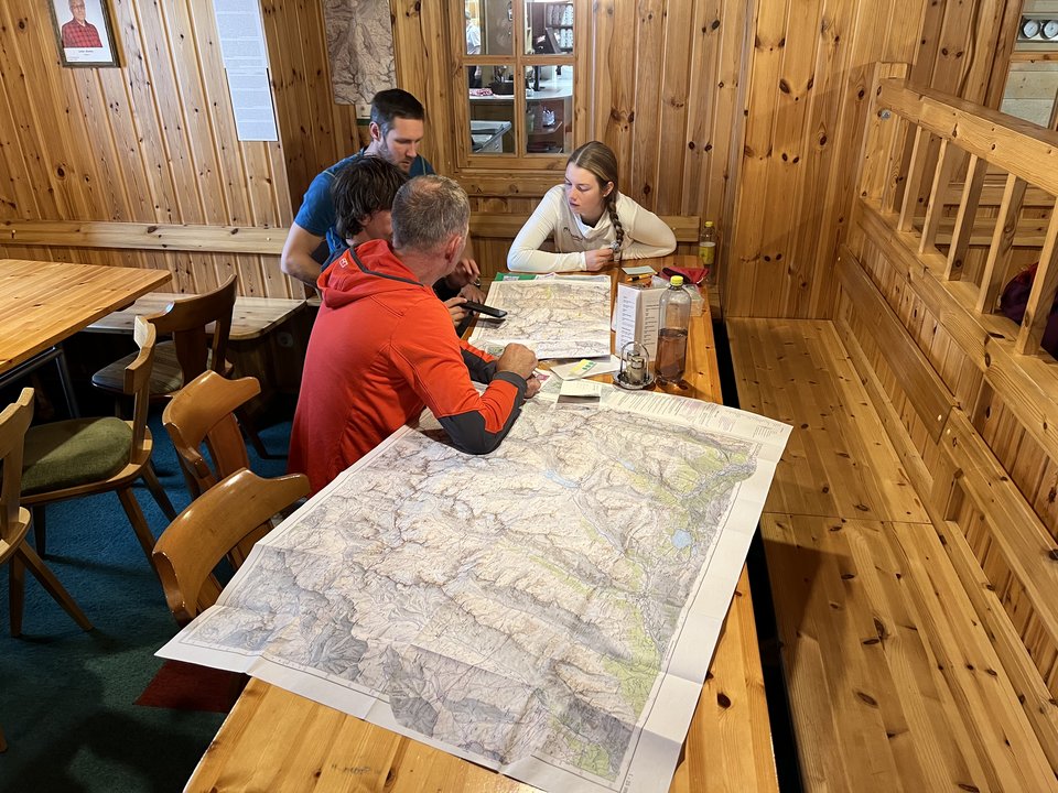 Die nachfolgende Diskussion über deren Verwendbarkeit in der Ortsstelle im Speziellen und in der Vorarlberger Bergrettung im Allgemeinen unterstrich den großen Lernfortschritt, den die Ausbilder-Anwärter seit Beginn ihrer Ausbildung bereits hinter sich gelassen hatten und wie sehr sie sich bereits in ihrer Rolle als verantwortungsvolle Lenker in Sachen Materialkunde und Ausbildungsdidaktik wohl fühlten. Erneut schlüpften wir in die tropfnassen Einsatzkleider, verließen die warme Hütte in das kalte windige Naß da Draußen und übten bewährte und neue Techniken der organisierten Rettung. Vor dem Abendessen folgte noch ein intensiver Einschub zum Thema Orientierung. Marschzahl und Zugangsmöglichkeiten auf die Sonntagsziele wurden sorgfältig abgewogen und berechnet, diskutiert und angepasst.