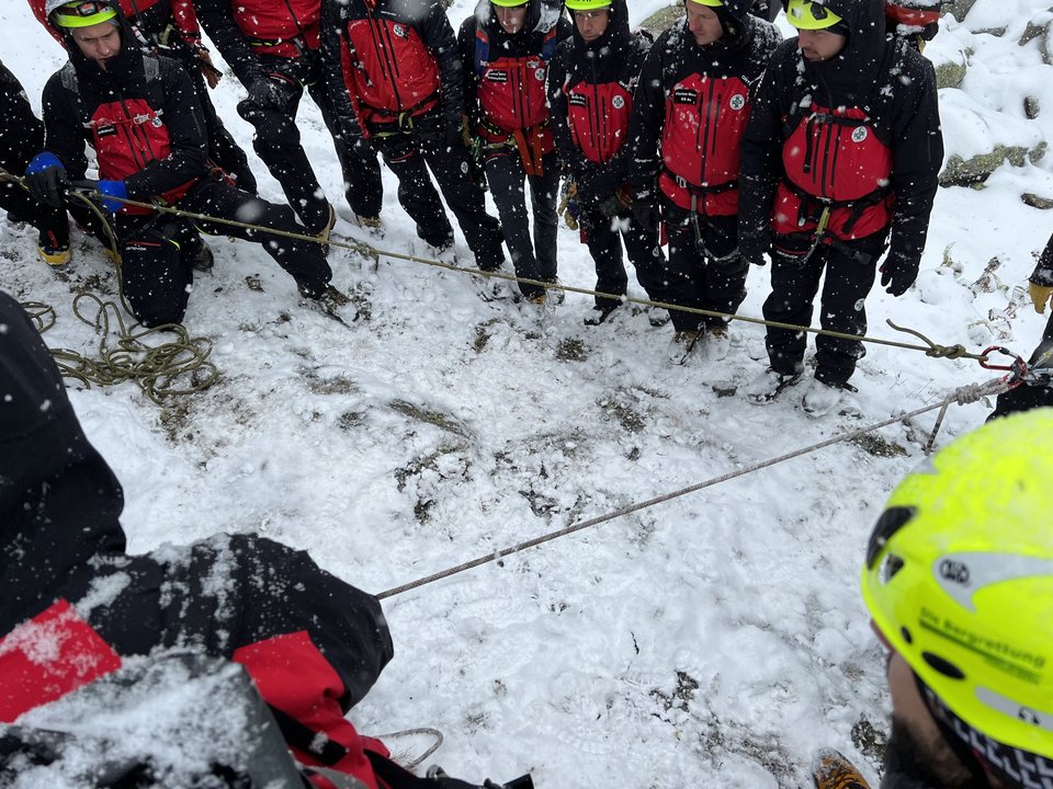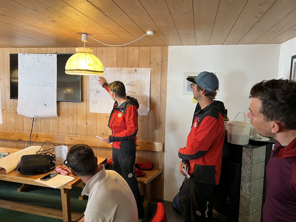 Das zunehmend schlechter werdende Wetter und der hart peitschende Wind zwang uns, die Feedbackrunde über Rhetorik und Didaktik in der Hütte durchzuführen. Die roten Jacken von einer weissen Eisschicht bedeckt, die Helme und Halstücher tief ins Gesicht gezogen, die Augenbrauen vereist und zitternd vor Kälte erreichten wir spät nachmittags die Hütte. Begleitet von einem straffen Zeitplan bewerteten alle Teilnehmenden Station um Station und ließen sich von den jeweiligen Pendants ihre Demonstrationstechnik, den Aufbau der Station und die Details der Rettungstechnik dazu erklären. Im Mittelpunkt stand dabei das zu erarbeitende Thema und die passende Platzwahl einerseits, sowie die Präsentation und die Wissensvermittlung andererseits; eben jene Arbeitsschritte, die die angehenden Lehrenden in ihrer zukünftigen Tätigkeit stets begleiten werden. Bei den Fragerunden wurden dennoch technische Detailfragen mitunter leidenschaftlich diskutiert, erörtert, erklärt, verworfen.
