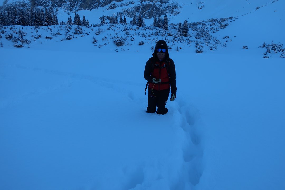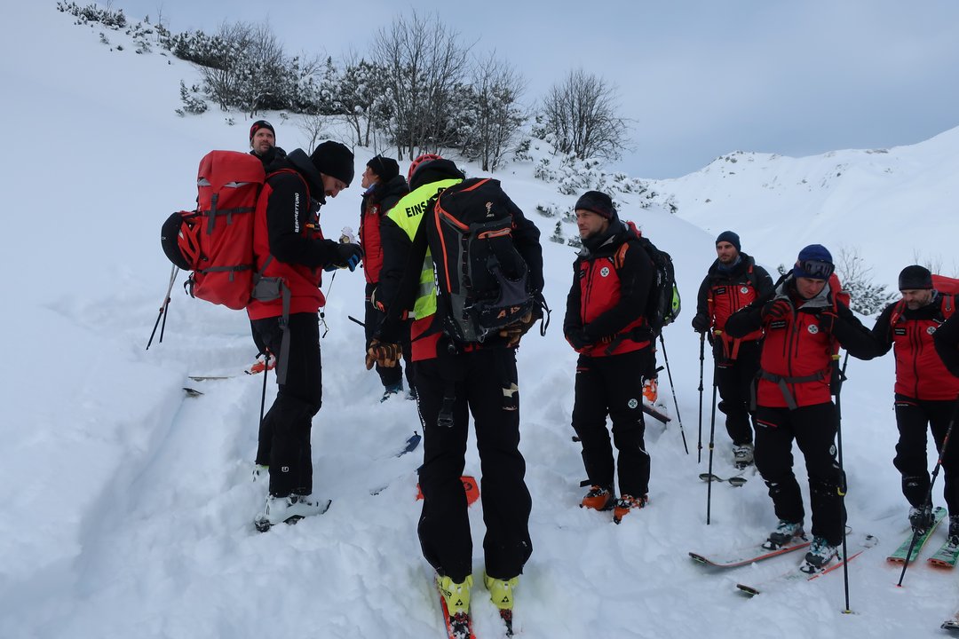 Der Kurs begann am Freitagmorgen mit einem herzlichen Empfang und der Gruppeneinteilung auf dem Parkplatz der Golmerbahn. Die kalte Morgenluft und das Knirschen des Schnees unter den Stiefeln ließen die Teilnehmerinnen und Teilnehmer direkt in die richtige Stimmung eintauchen. Der erste Höhepunkt des Tages war das Akja-Fahren im Pistengebiet – eine sportliche und technische Herausforderung, die von allen gemeistert wurde. Die erste Nagelprobe für die Teilnehmenden war ein realer Einsatz direkt im Skigebiet mit Akja und Hubschrauber. Anschließend widmeten sich die Gruppen im alpinen Gelände Themen, wie Tourenplanung, Lawinenlagebericht, Stop or Go, Geländeeinschätzung und Spuranlage.