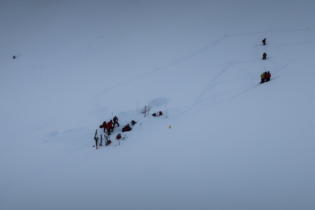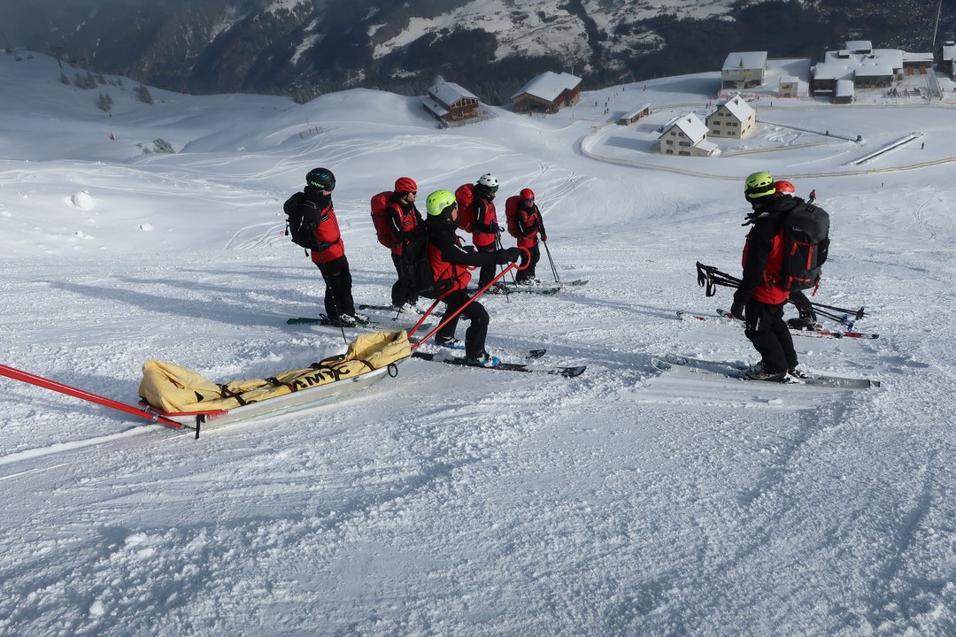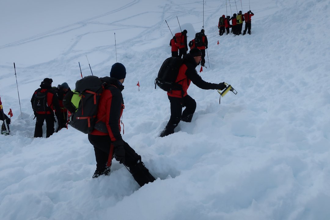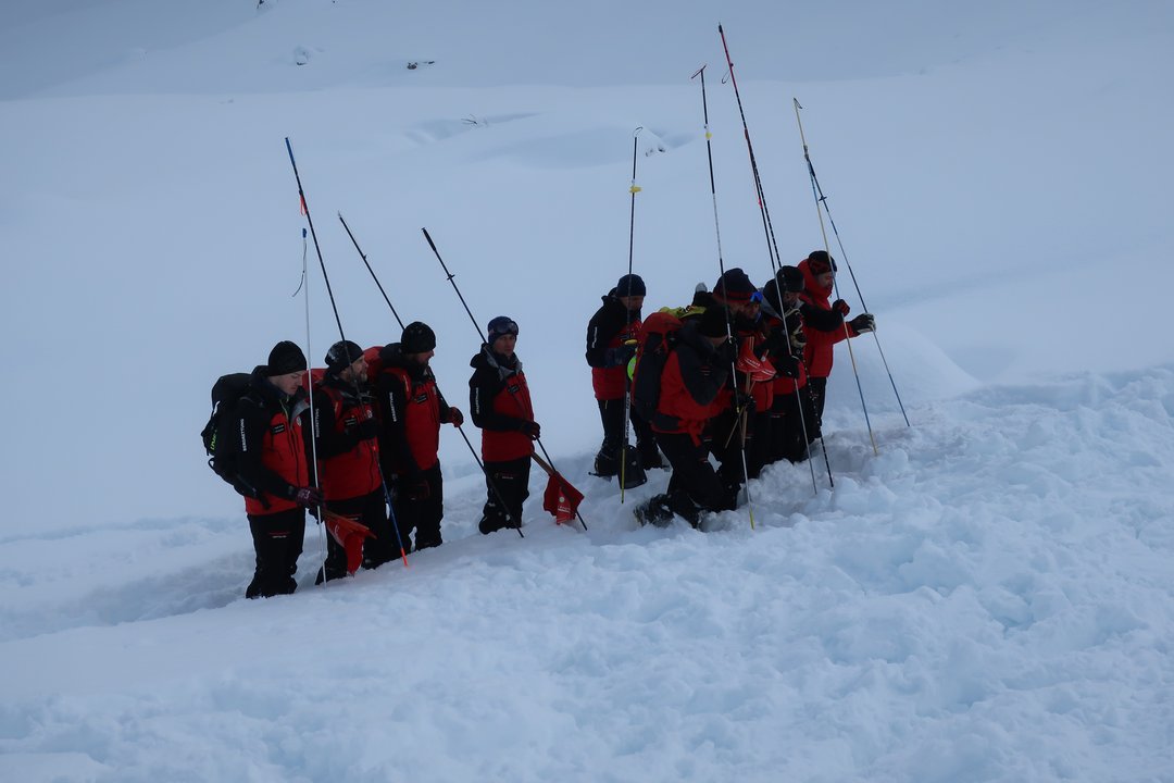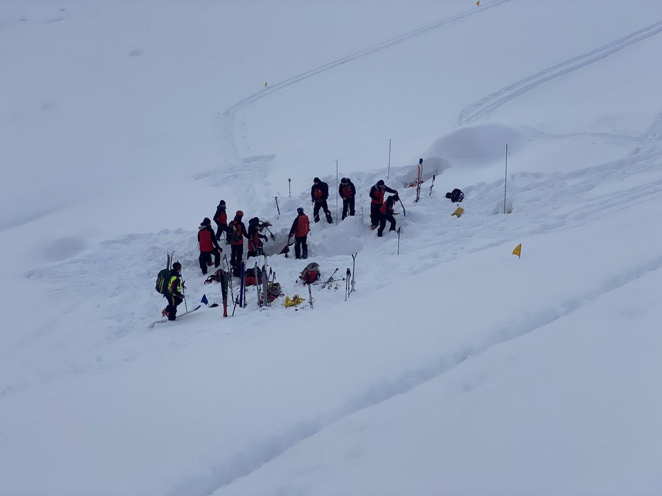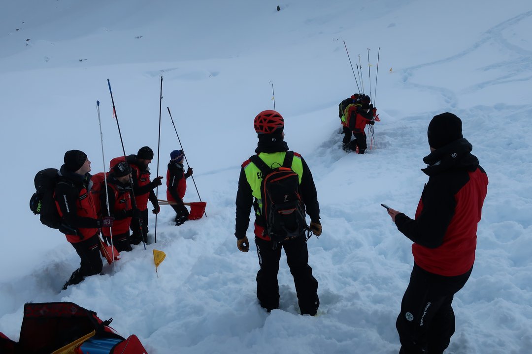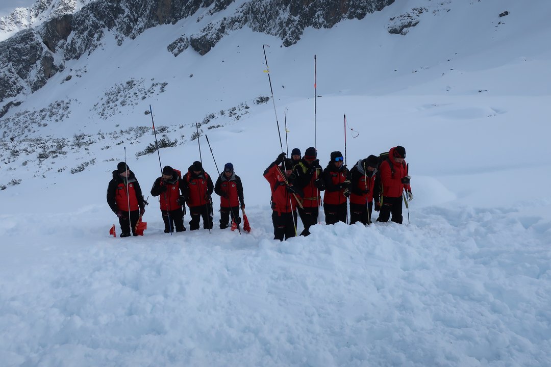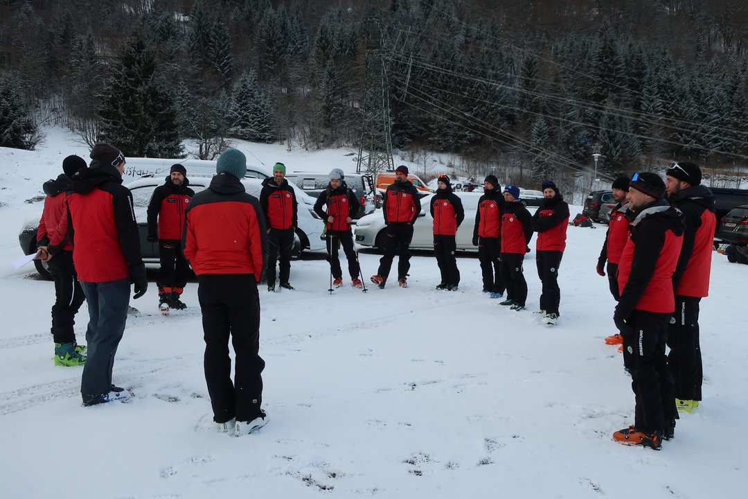 Der letzte Tag des Kurses begann mit einer groß angelegten Lawinenübung. Die Ausbilder hatten ein realistisches Szenario vorbereitet, das von den Anwärtergruppen souverän gemeistert wurde. Mit professioneller Organisation und klarem Teamgeist bewältigten sie alle Aufgaben von der Verschüttetensuche bis zum Abtransport.