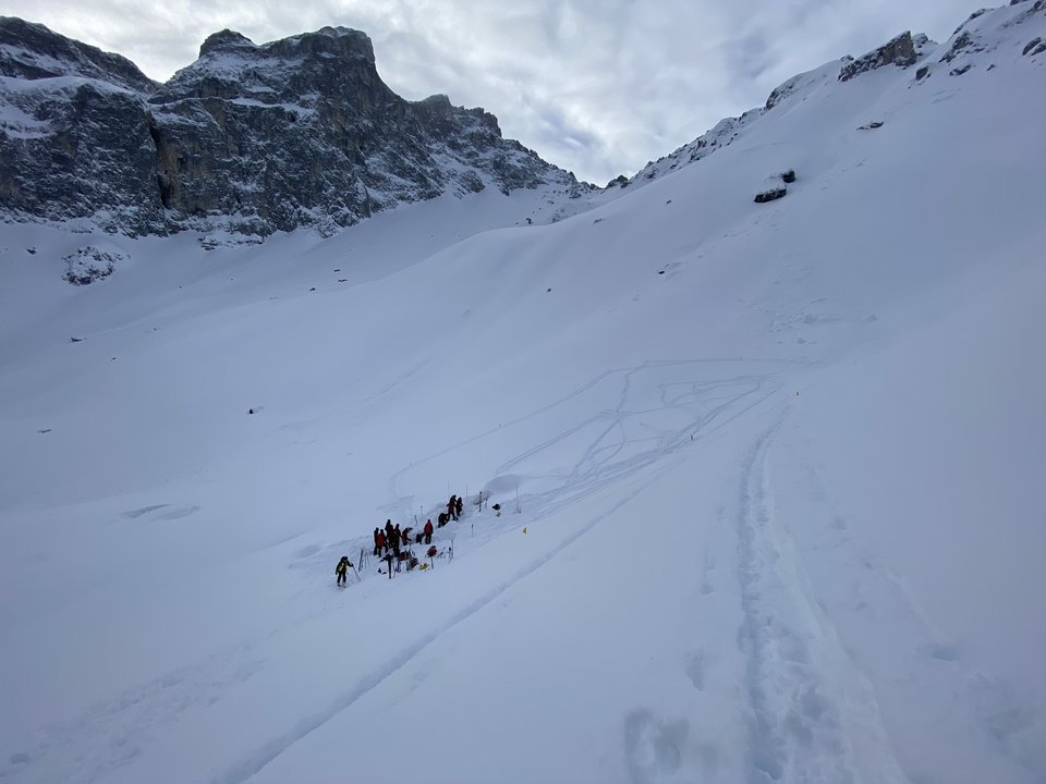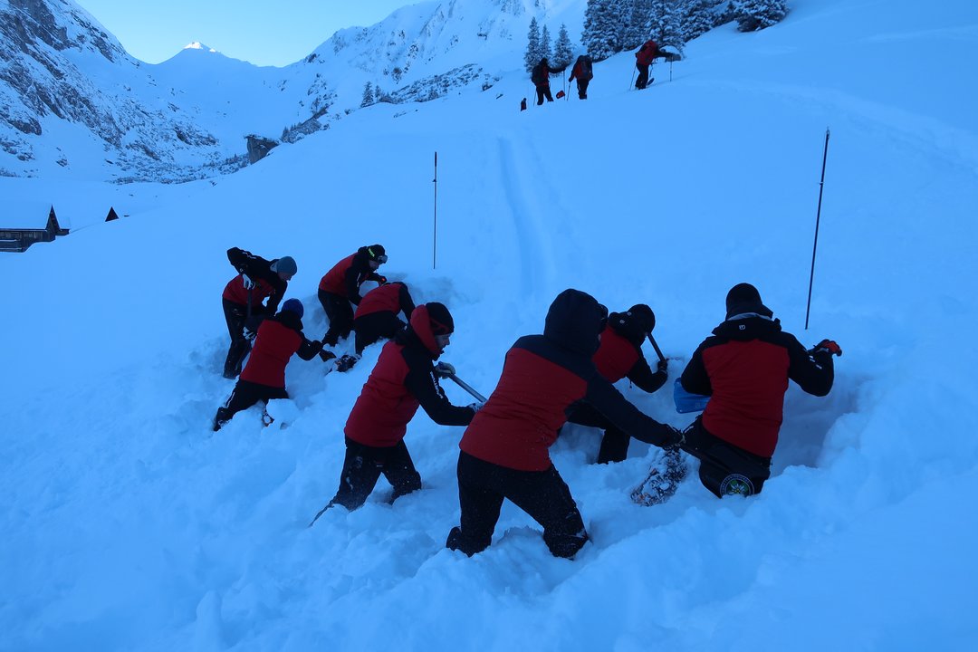 Ein früher Start in den Tag und strahlender Sonnenschein sorgten für optimale Bedingungen für den Stationsbetrieb. Die Teilnehmerin und Teilnehmer durchliefen verschiedene Stationen: Schneeprofil- und ECT-Tests, LVS-Suche und Störquellenanalyse, Verankerungen und Belastungstests, Recco. Nach einem stärkenden Mittagessen setzten die Gruppen ihre Übungen fort, diesmal mit Fokus auf Schaufelförderband, Sondieren und Lawineneinsatz, LVS Erstempfang und Koppellagen.