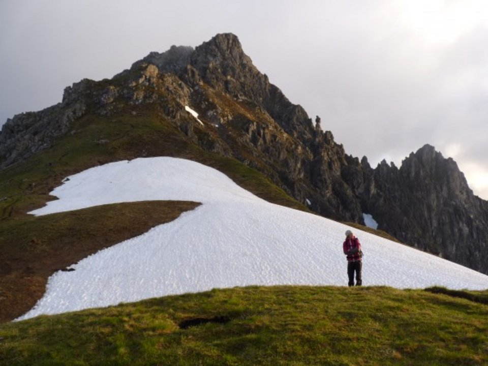 - wenn bei der Tourenplanung schon die Querung eines Schneefeldes bekannt ist, Gamaschen, Trekkingstöcke mit breiten Tellern, Leichtsteigeisen und Handschuhe mitnehmen,